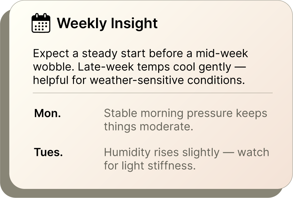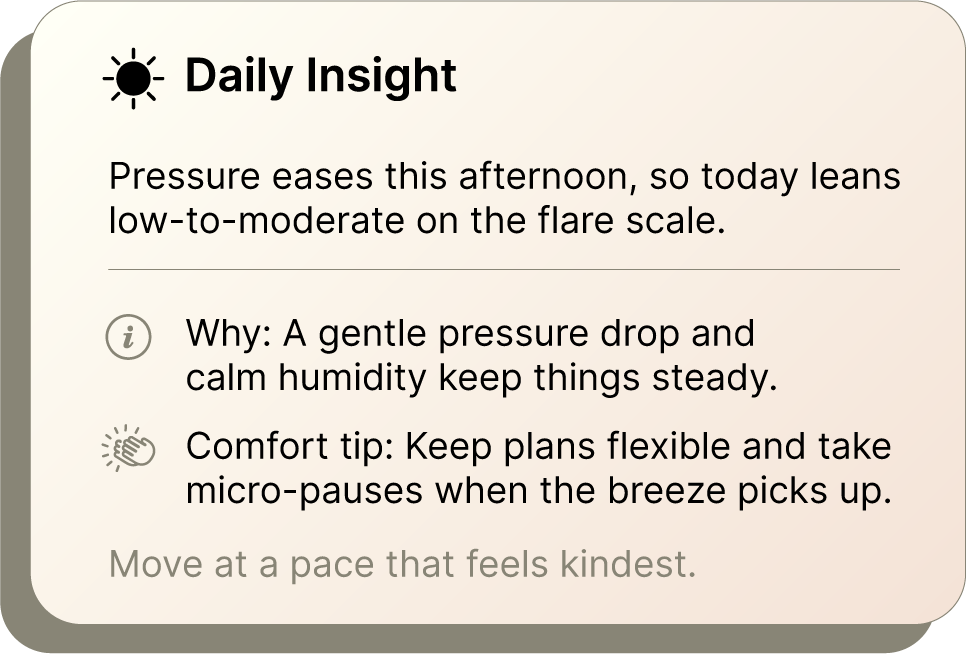 FlareWeather was created to offer something simple and supportive: a clearer sense of how the day’s weather may interact with your body, without medical claims or complex tracking.